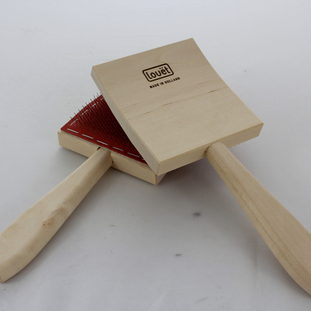 Louët handcards are made of tulip wood, a Dutch Poplar variety. These light weighted hand carders have a curved back and ergonomic handles that fit comfortably in your hands. These have extra fine cloth (110 teeth per inch) made of high grade plated steel wire and measure 10 x 10 cm (4" x 4")