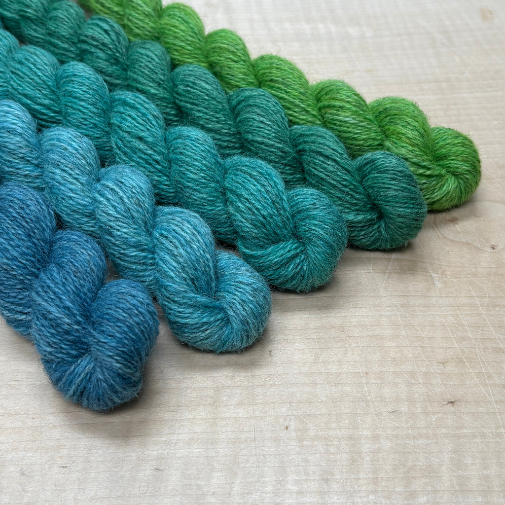 The Hampshire is a scrumptious lofty yarn, with good stitch definition. Once blocked the fabric blooms and has a silky quality which only improves with wear. Just right for a snuggly cardigan or a colour work project. The colours are based on the natural colours of our home county, working with the variegated base rather than trying to obliterate it with saturated colour.