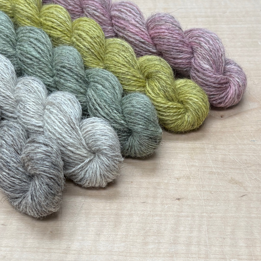 The Hampshire is a scrumptious lofty yarn, with good stitch definition. Once blocked the fabric blooms and has a silky quality which only improves with wear. Just right for a snuggly cardigan or a colour work project. The colours are based on the natural colours of our home county, working with the variegated base rather than trying to obliterate it with saturated colour.